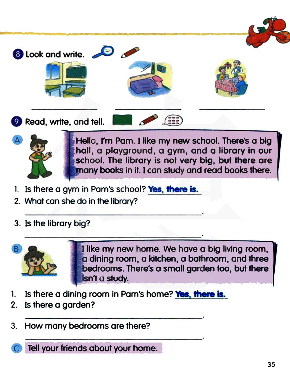 你好,我是盼姆,我喜欢我的新学校。我们学校有一个大礼堂,一个操场,一间健身房,和一个图书馆。图书馆不是很大,但是它里面有很多书。我可以在那里学习和读书。