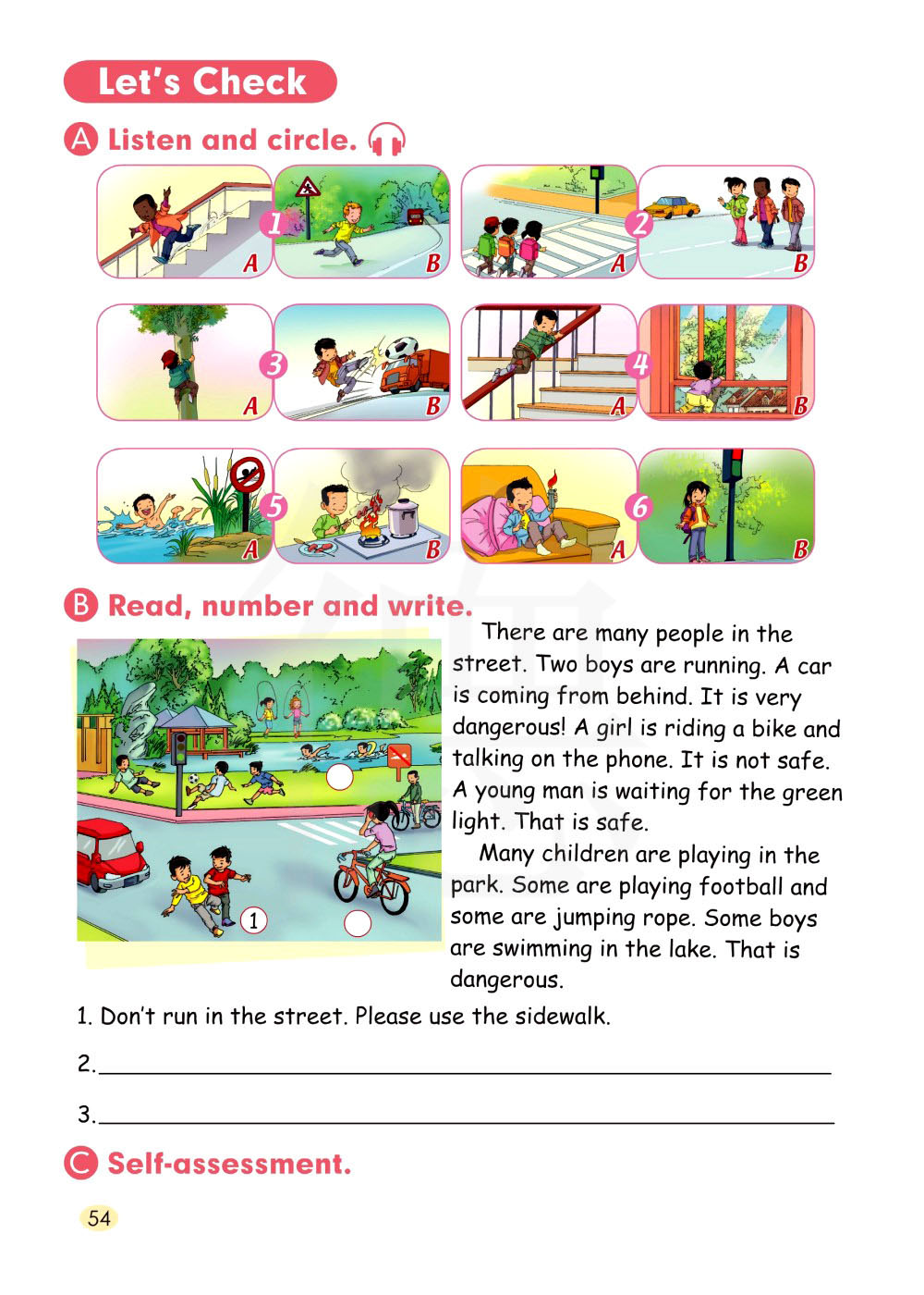 街上有很多人,两个男孩在奔跑,一辆车从后面开过来,这非常危险。一个女孩一边骑自行车,一边打电话,这不安全。一个年轻人在等绿灯。那很安全。