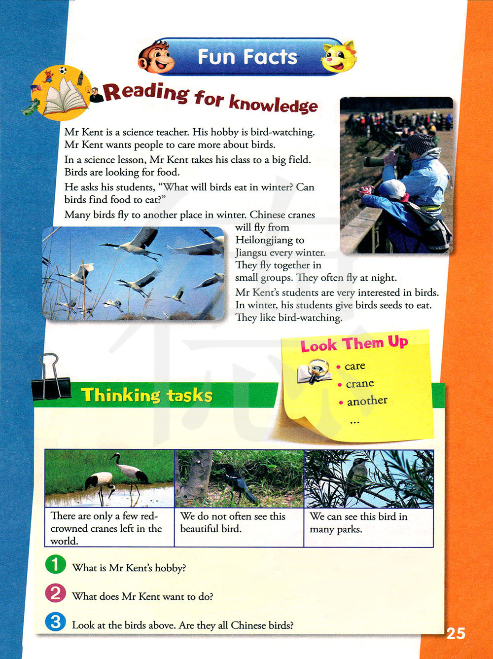 肯特先生是科学课老师,他的爱好是观察鸟类。肯特先生想让人们多关心鸟类。