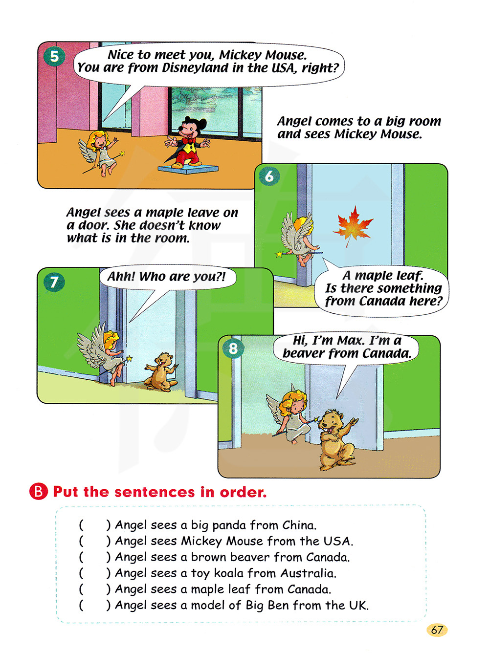 安琪儿看到一只来自中国的大熊猫。 安琪儿看到来自美国的米老鼠。 安琪儿看到一只来自加拿大的棕色海狸。 安琪儿看到一个来自澳大利亚的玩具考拉。 安琪儿看到一片来自加拿大的枫叶。 安琪儿看到一个来自英国的大本钟模型。