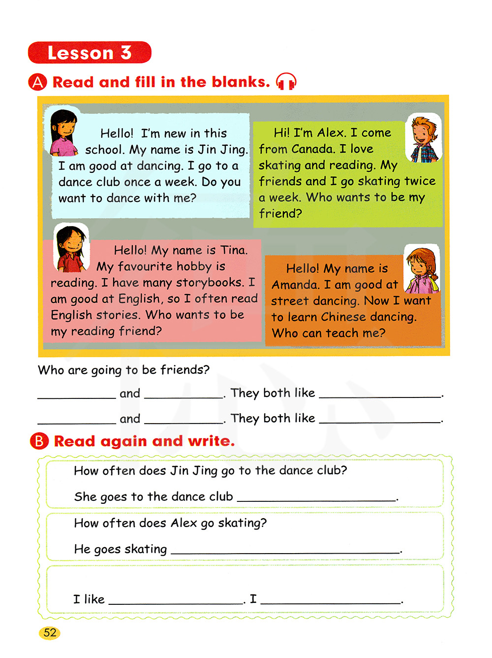 谁将要成为朋友? 金晶和阿曼达,他们都喜欢跳舞。 艾利克斯和缇娜,他们都喜欢读书