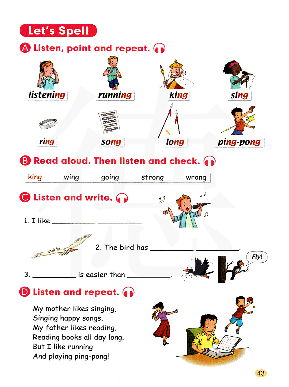 我妈妈喜欢唱歌, 唱快乐的歌。 我爸爸喜欢读书, 整天的读书。 但是我喜欢跑步,和打乒乓球。