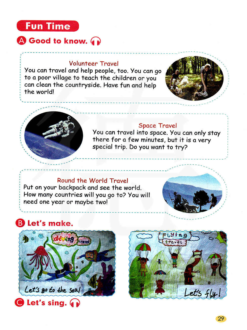 志愿者旅行 你可以旅行,并且帮助他人。 你可以去一个贫穷的村庄教孩子们学习, 或者你可以打扫乡村。 玩得开心,同时帮助了世界!