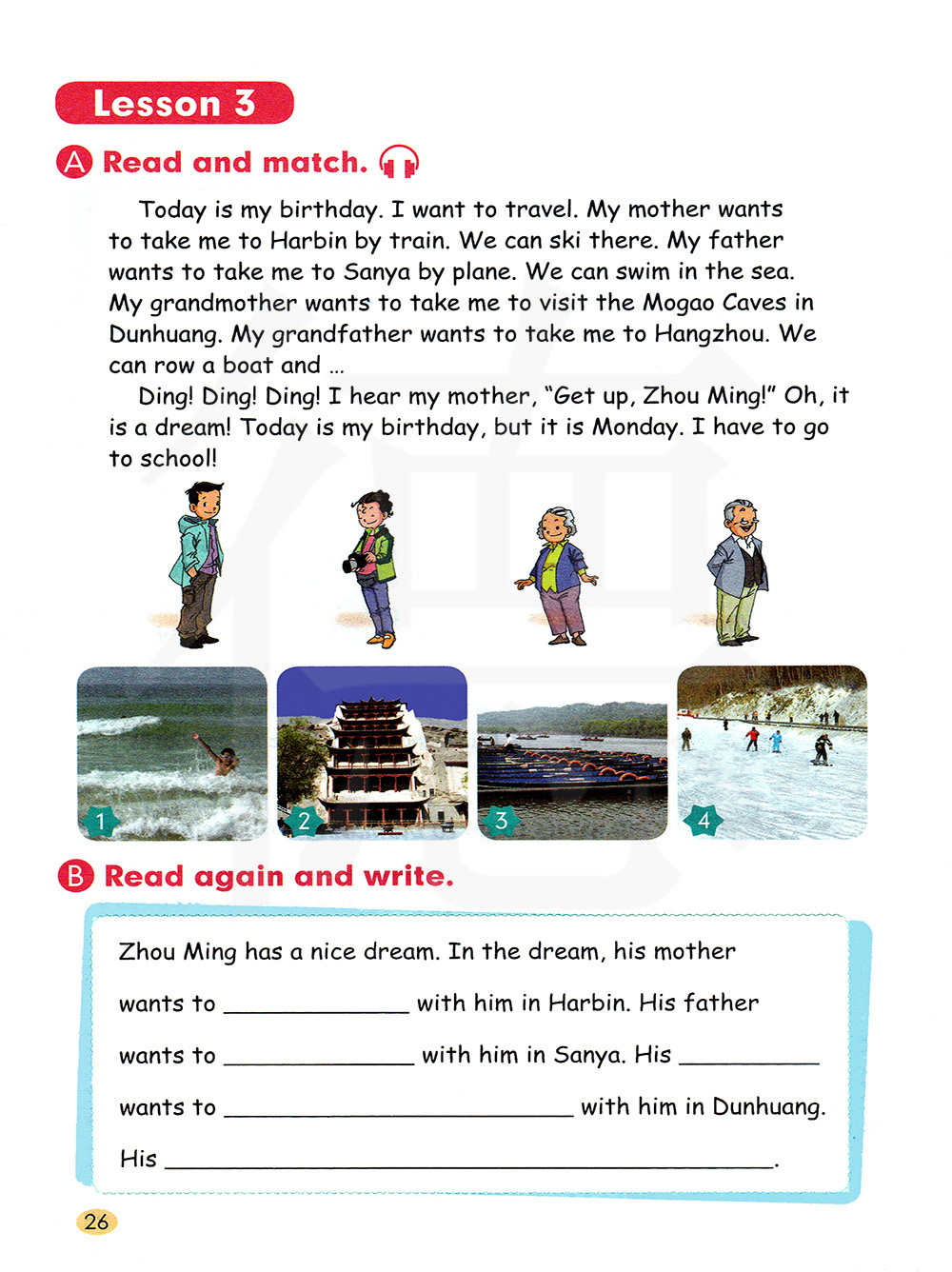 今天是我的生日。 我想去旅行。 我妈妈想带我坐火车去哈尔滨。 我们可以在那里滑雪。 我爸爸想带我坐飞机去三亚。 我们可以在海里游泳。 我奶奶想带我去参观敦煌的莫高窟。 我爷爷想带我去杭州。 我们可以划船和……