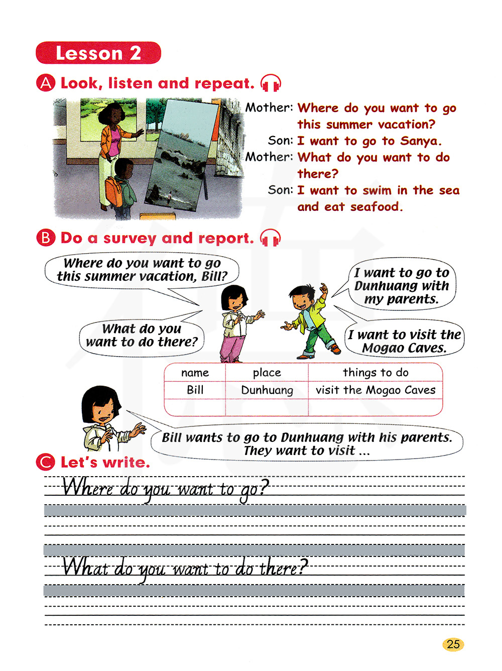 你想去那里做什么? 我想去海里游泳和吃海鲜。
