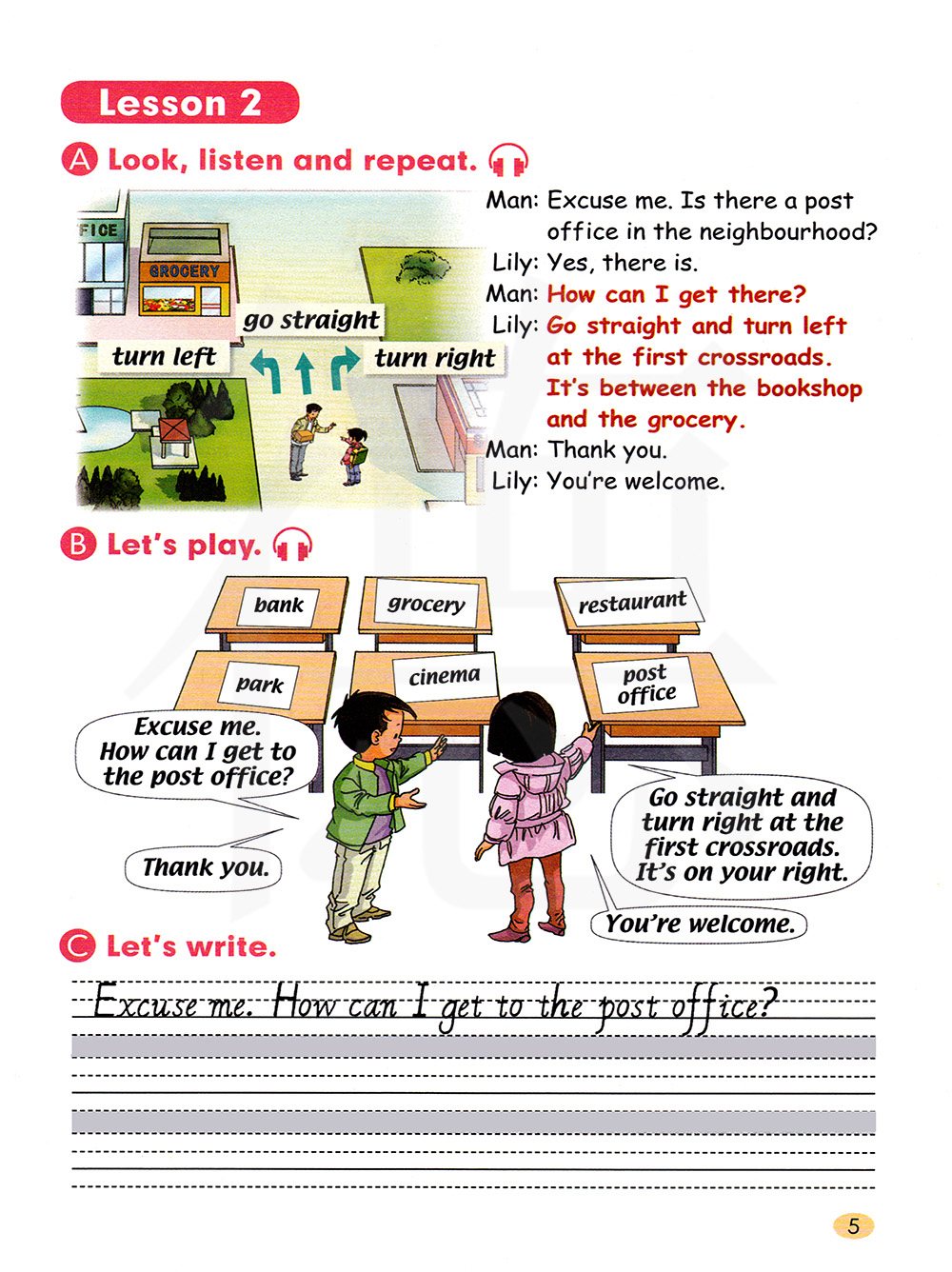 我该怎么到那儿呢? 直走然后在一个十字路口向左转。它在书店和食品杂货店之间。