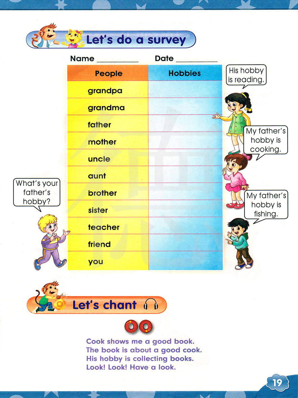 厨师向我展示了一本好书。那本书讲的是关于一个好厨师。他的爱好是收集书。看!看!来看看。
