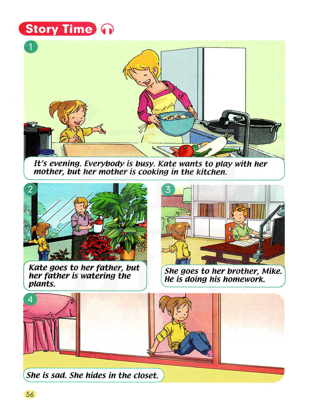 晚上了。 每个人都很忙。 凯特想和她妈妈玩儿, 但是她妈妈正在厨房做饭。