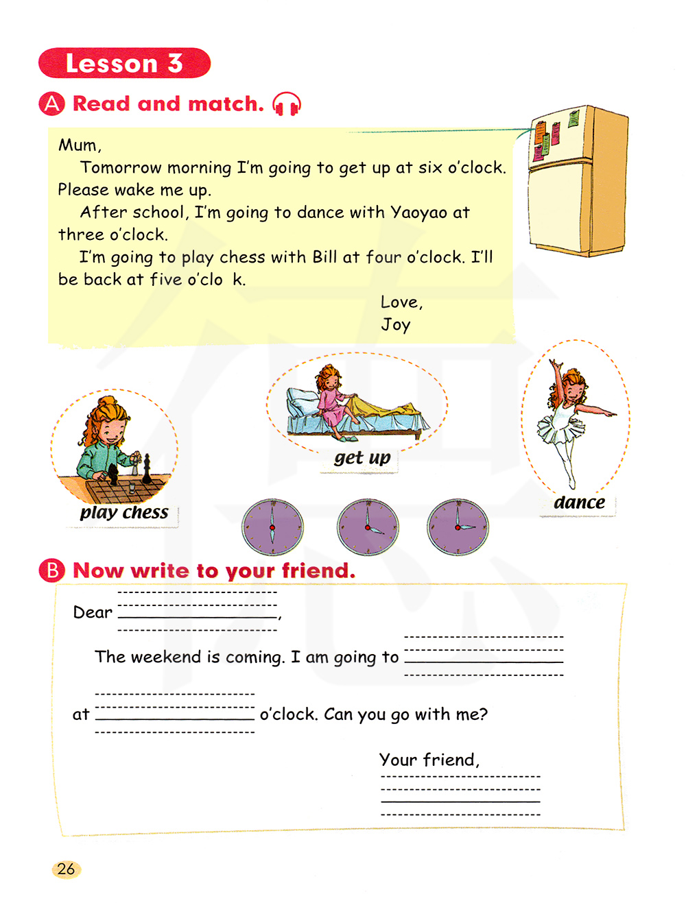妈妈: 明天早上我准备在六点钟起床。 请您叫我起床。 放学后, 在三点钟我要和瑶瑶一起去跳舞。 四点钟我要和比尔下棋。 我会在五点钟回家。 爱你的,乔伊