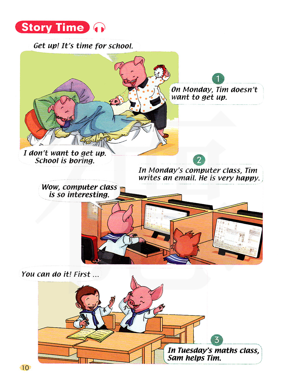 在星期一的计算机课上, 提姆写了一封电子邮件。 他非常开心。