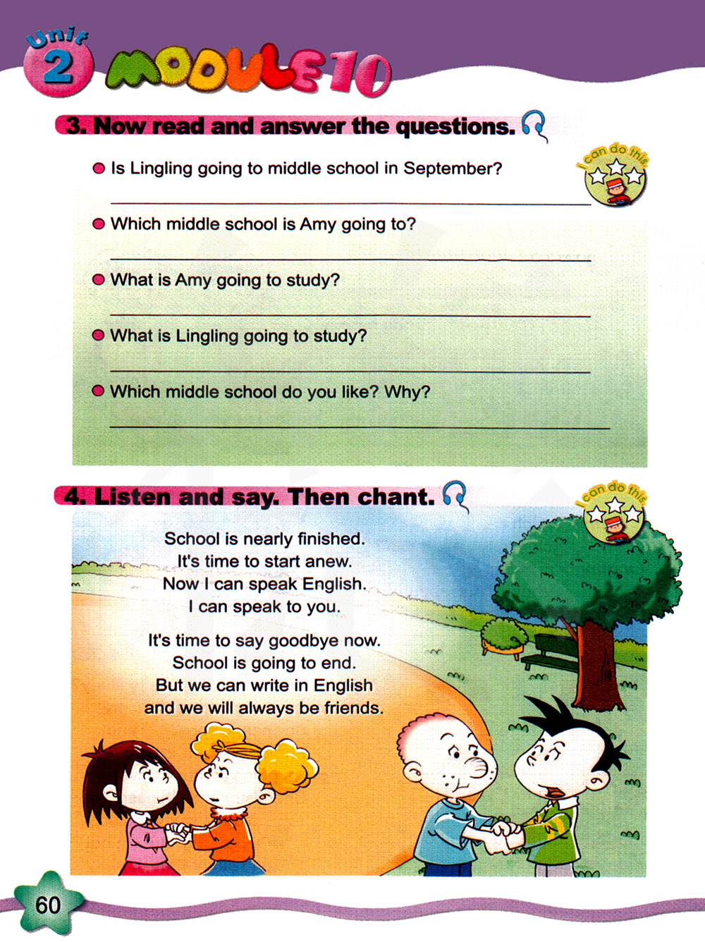 学校生活就要结束了。是时候重新开始了。 现在我会说英语了。 我能跟你说话。 现在是时候说再见了。学校生活就要结束了。 但是我们可以用英语书写了,而且我们会一直都是朋友。