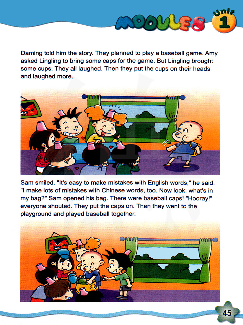 萨姆笑了。“英语单词很容易犯错,”他说。 “我在汉字方面也犯了很多错误。 现在看看,我书包里有什么?”萨姆打开他的书包。里面有棒球帽!“万岁!”