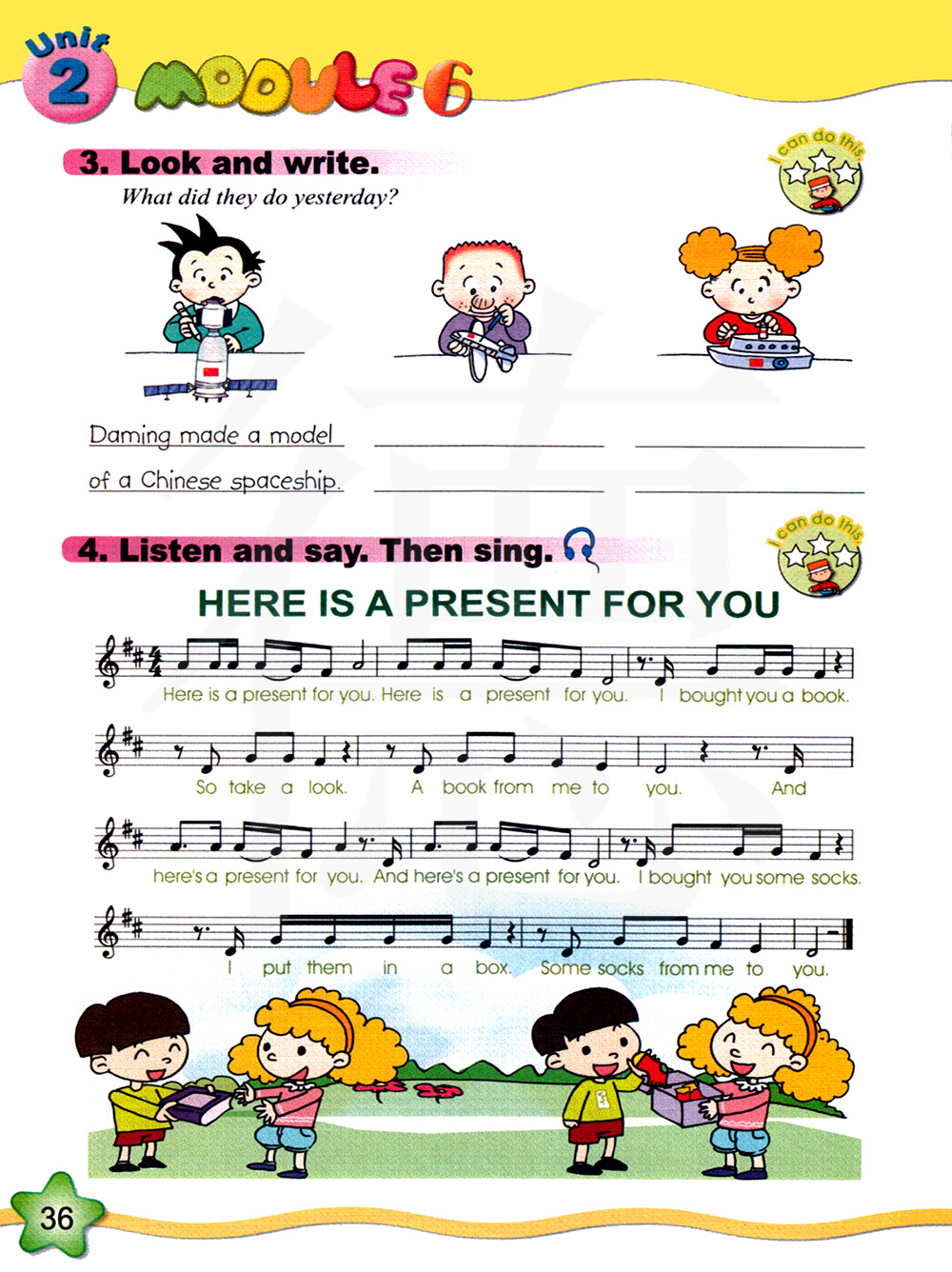 这是一份给你的礼物。 这是一份给你的礼物。 我为你买了一本书。 所以看一看吧。 我送给你的一本书。这是一份给你的礼物。 这是一份给你的礼物。 我给你买了一些袜子。 我把它们放进一个盒子里。 我送给你的一些袜子。(歌曲)