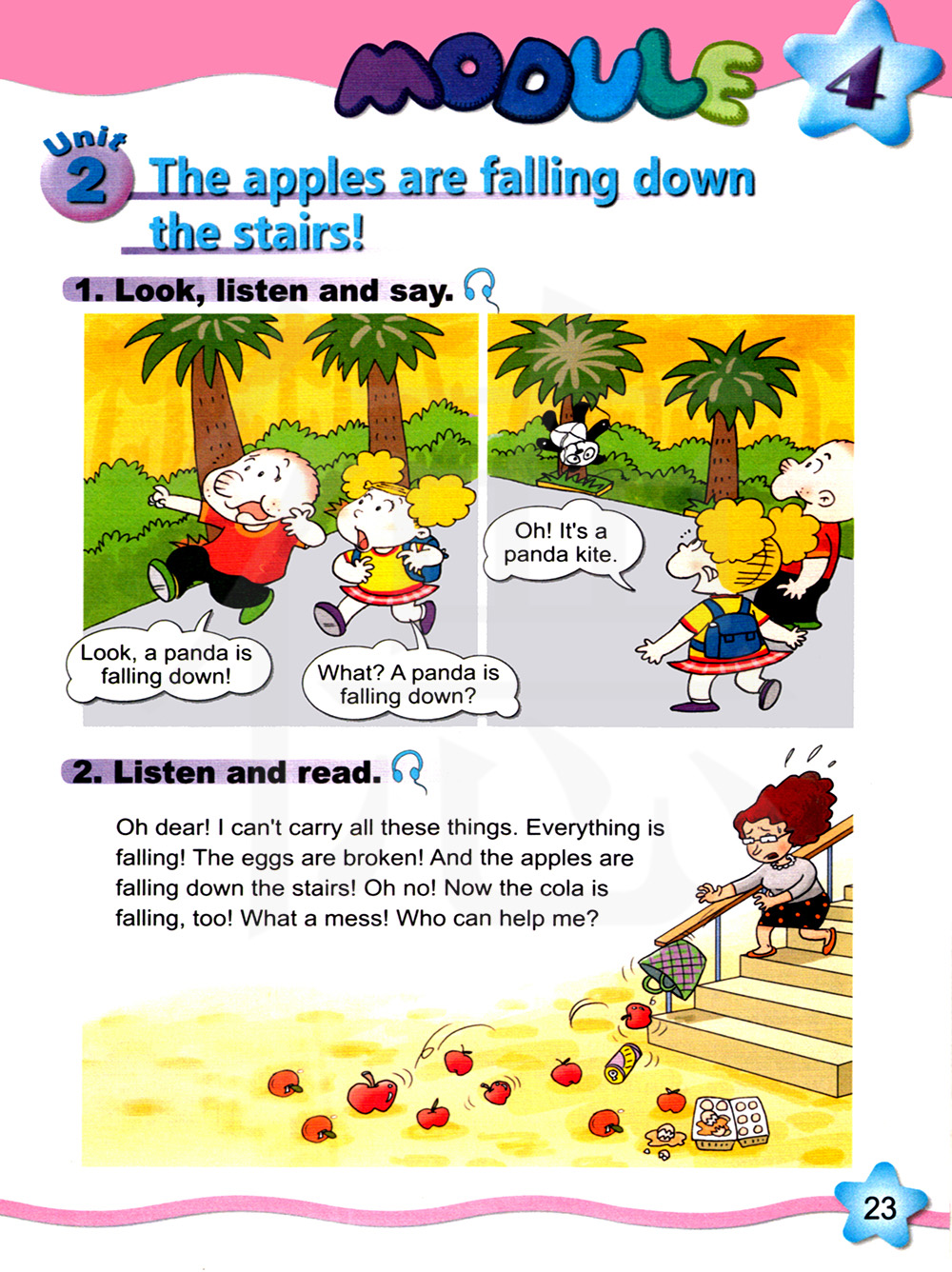 学习重点:能口头运用The apples are falling down the stairs.说明正在发生的事。