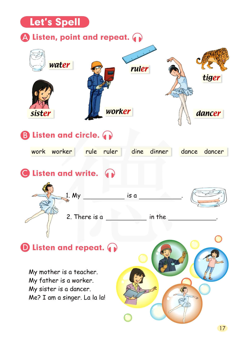 我的妈妈是位老师。我的爸爸是位工人。我的姐姐是位舞者。我?我是一位歌手。啦啦啦!