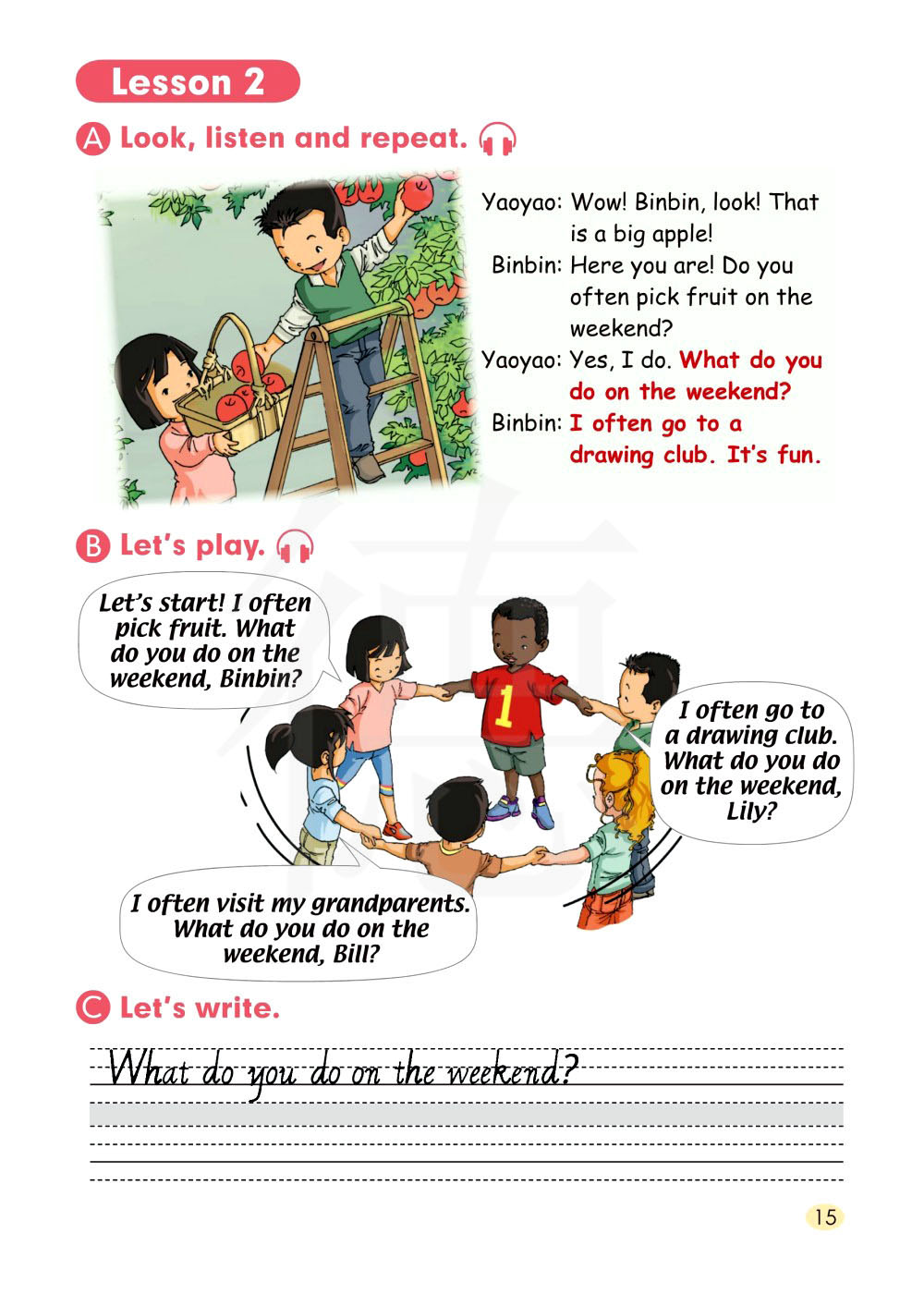 我们开始吧!我经常摘水果。彬彬,你在周末做什么?