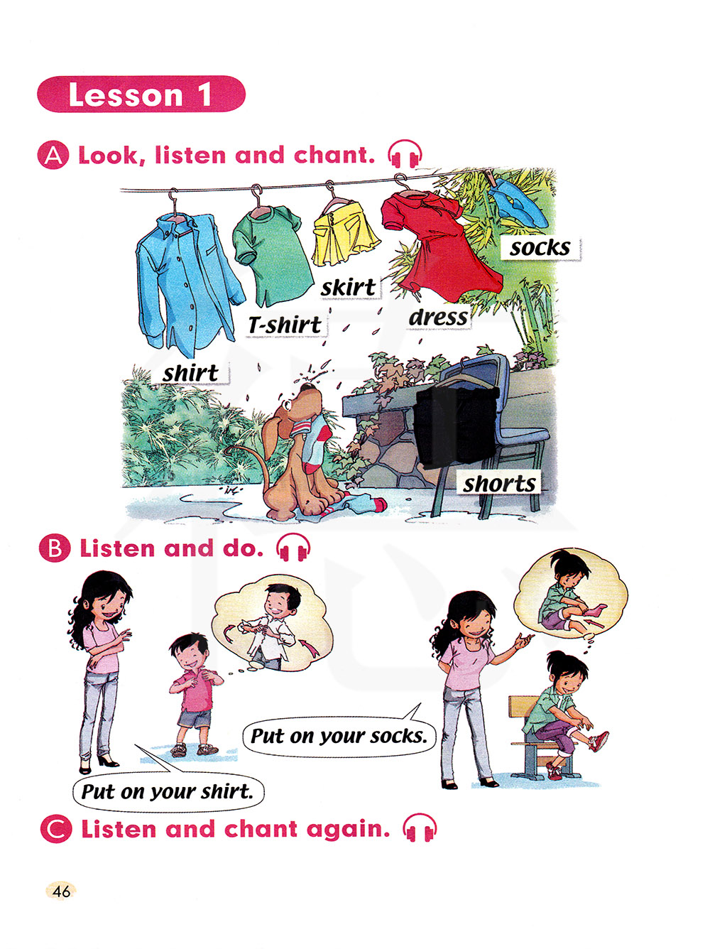 听一听,做一做。 穿上你的衬衫。 穿上你的短袜。 再听一听并说唱。 蓝色的衬衫,蓝色的衬衫, 我喜欢我蓝色的衬衫。 黄色的裙子, 黄色的裙子, 我喜欢我黄色的裙子。 绿色的T恤衫, 绿色的T恤衫 我喜欢我绿色的T恤衫。 红色的连衣裙, 红色的连衣裙, 我喜欢我红色的连衣裙。 蓝色的短袜,蓝色的短袜 我喜欢我蓝色的短袜。 黑色的短裤, 黑色的短裤, 我喜欢我黑色的短裤。 我喜欢我所有的衣服。