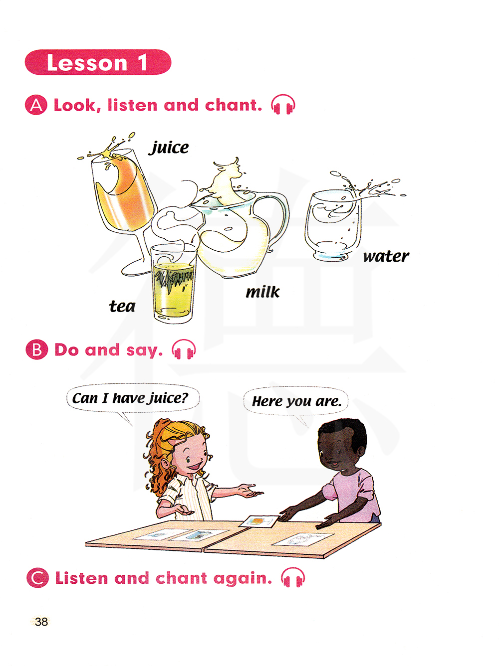 做一做,说一说。 我可以要果汁吗? 给你。 再听一听并说唱。 我可以要水吗, 水,水? 是的,你可以。 它对你有好处。 我可以要果汁吗, 果汁,果汁? 是的,你可以 它对你有好处。 我可以要牛奶吗, 牛奶,牛奶? 是的,你可以。 它对你有好处。 我可以要茶吗,茶,茶? 不,你不可以。 它对你有坏处。