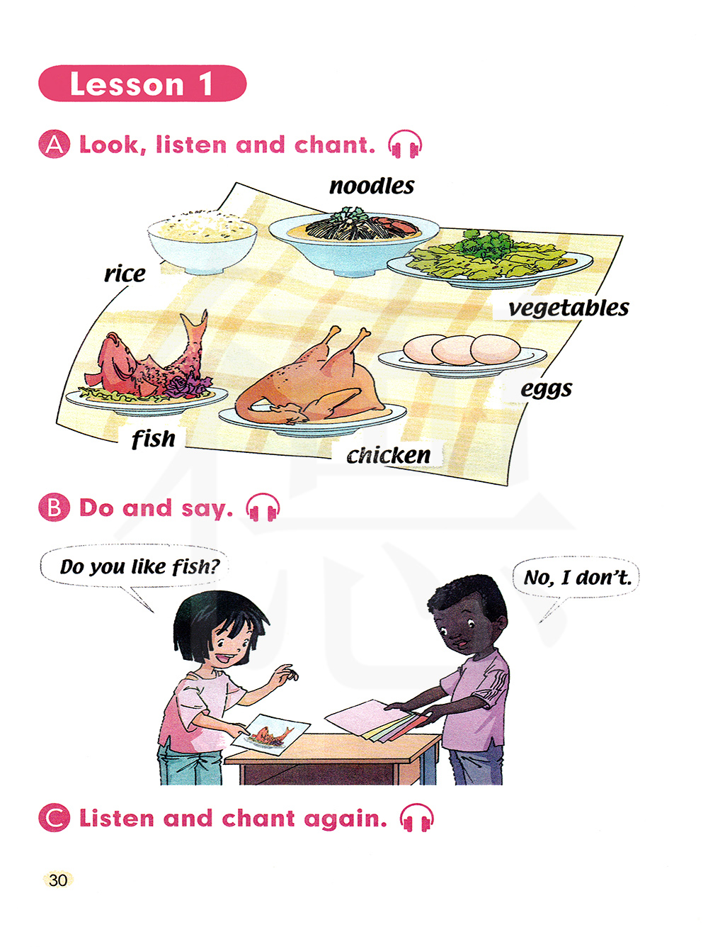 看一看,听一听并说唱。 米饭 面条 蔬菜 鱼 鸡 鸡蛋 你喜欢面条吗, 面条,面条? 不,不,我不喜欢。 你喜欢鸡吗 鸡,鸡? 是的,是的,我喜欢。 你喜欢鸡蛋吗, 鸡蛋,鸡蛋? 不,不,我不喜欢。 你喜欢蔬菜吗, 蔬菜,蔬菜? 是的,是的,我喜欢。 你喜欢鱼吗, 鱼,鱼? 不,不,我不喜欢。 你喜欢米饭吗, 米饭,米饭? 是的,是的,我喜欢! 米饭很好吃。