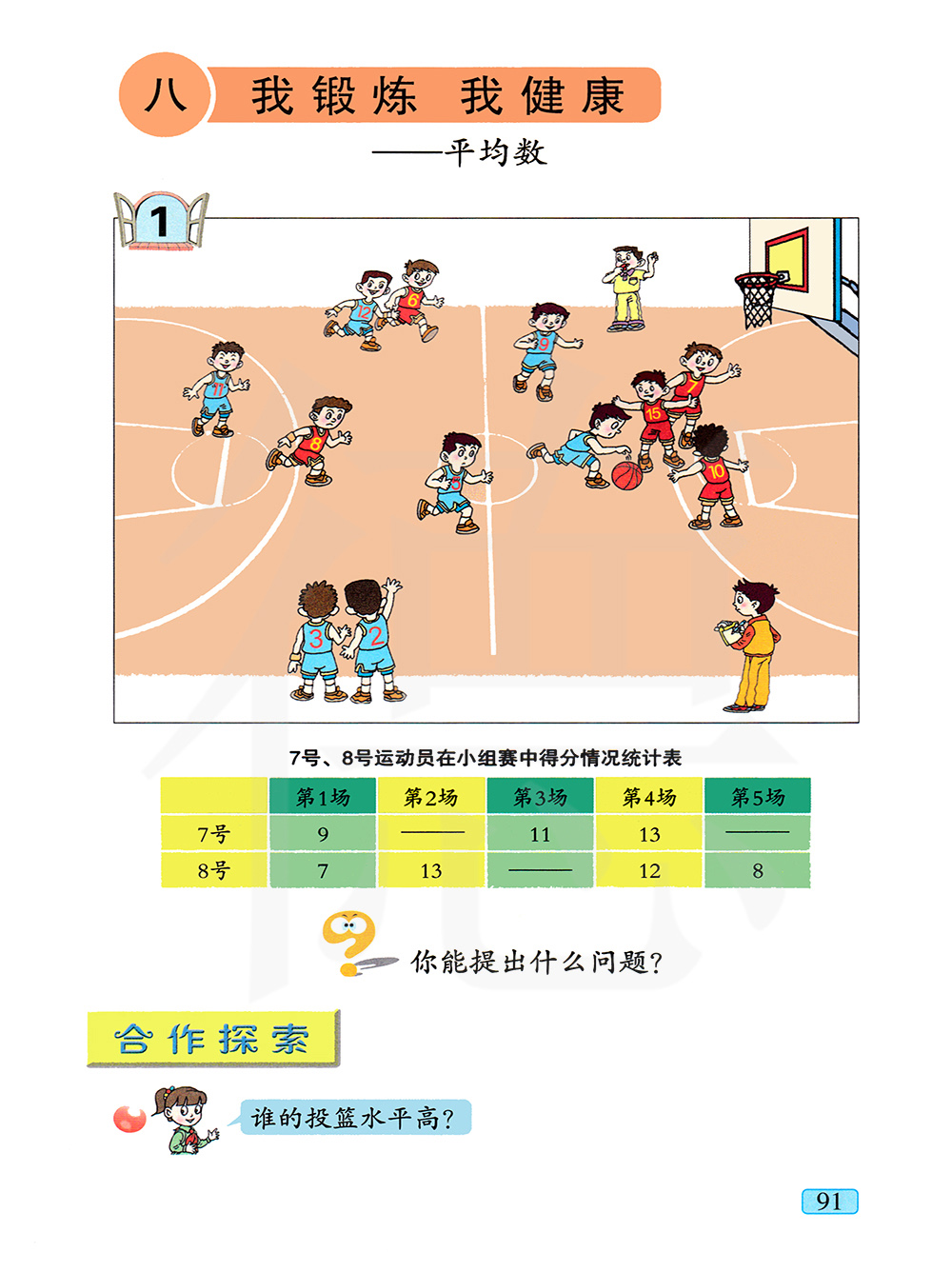 本单元息窗呈现的是篮球比赛中蓝队教练准备换人的情境。用统计表的形式提供了7号、8号两名队员在小组赛中的得分情况,引导学生解答“该换谁上场”的问题,展开对平均数知识的学习。通过对两个小队立定跳远成绩的整理,认识和学习复式分段统计表。
