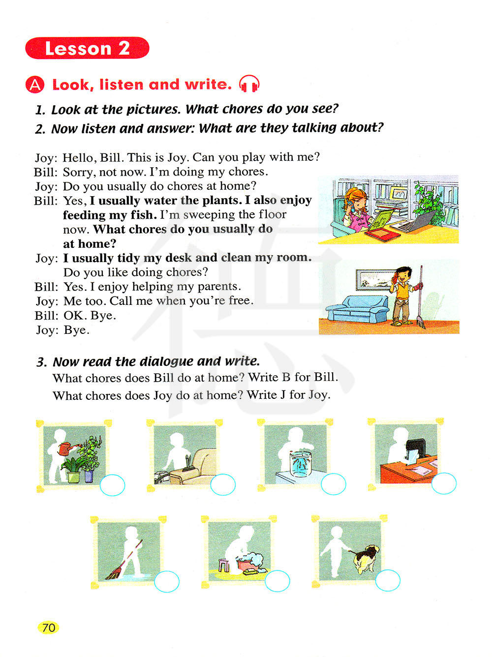 是的,我经常浇花。我也喜欢喂鱼。 我现在在扫地。你经常在家做什么家务?