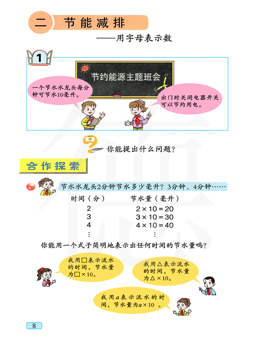 (2)将用字母表示数和运算律整合在一起学习。以往人教教材是将用字母表示数和运算律分开在两个单元学习的。先学运算律、再学用字母表示数,这样编排,既不利于学生用字母表示规律,更重要的是不利于学生理解代数的意义。本教材将运算律与用字母表示数整合在同一单元,且先学用字母表示数,再学运算律,有利于学生建立用字母表示数的意义,体会用字母表示数的优越性。同时为用字母表示定律奠定基础。