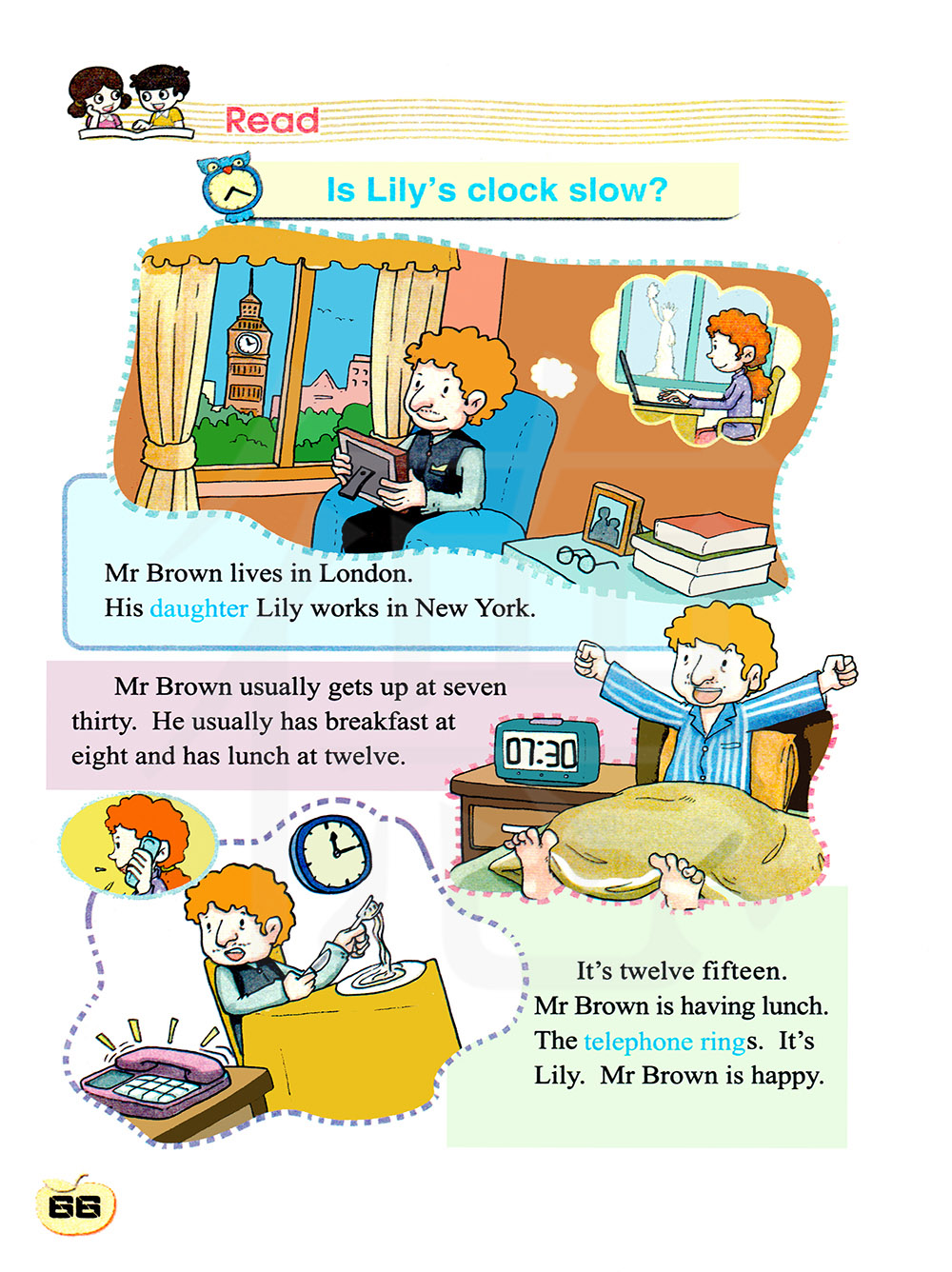 现在12点15分了。 布朗先生正在吃午饭。电话响了。是莉莉打来的。布朗先生很开心。
