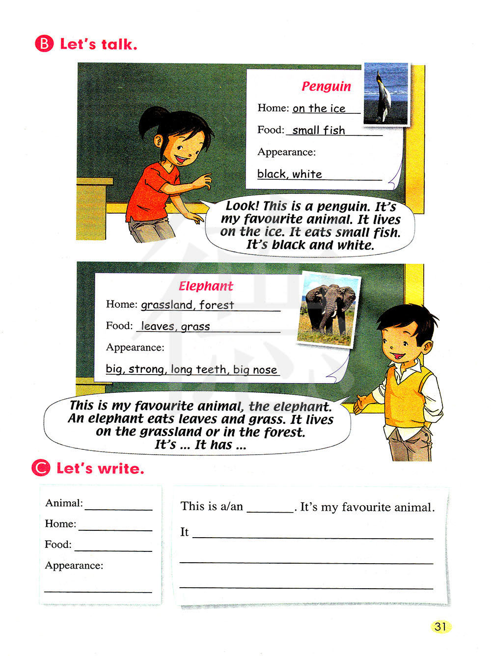 这是我最喜欢的动物,大象。大象吃叶子和草。它生活在草原上或森林里。它是......它有......