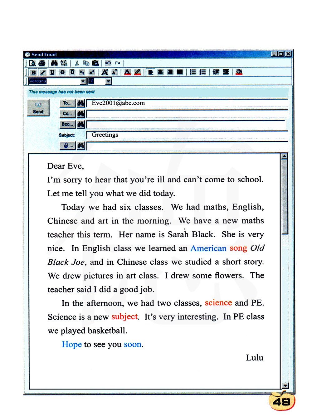 今天我们上了6节课。 我们上午上了数学、英语、 语文和美术。我们这个学期有一个新的数学老师。 她的名字叫萨拉·布莱克。 她非常好。 英语课上我们学了一首美国歌曲《Old Black Joe》,语文课上我们学了一个小故事。 我们在美术课上画了画。 我画了一些花。 老师说我画得很好。