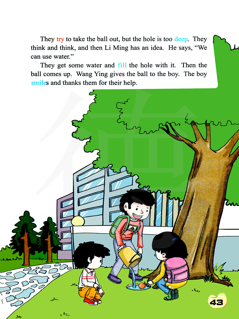 他们努力想把球拿出来, 但是洞太深了。 他们想啊想, 然后李明有了一个主意。 他说,我们可以用水。