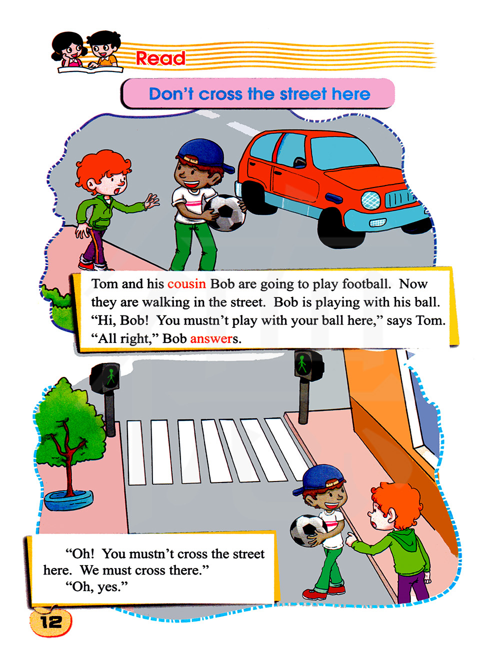 汤姆和他的表哥鲍勃要去踢足球。现在他们正在马路上走。鲍勃正在玩球。