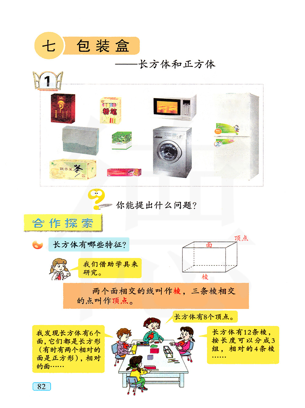 2、两个面相交的边叫做棱。三条棱相交的点叫做顶点。相交于一个顶点的三条棱的长度分别叫做长方体的长、宽、高。