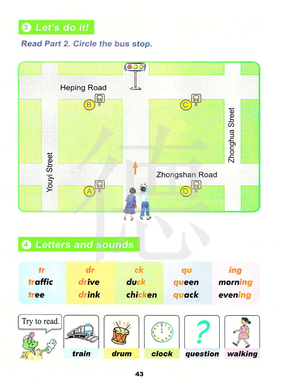 读第二部分。圈出公交站台。