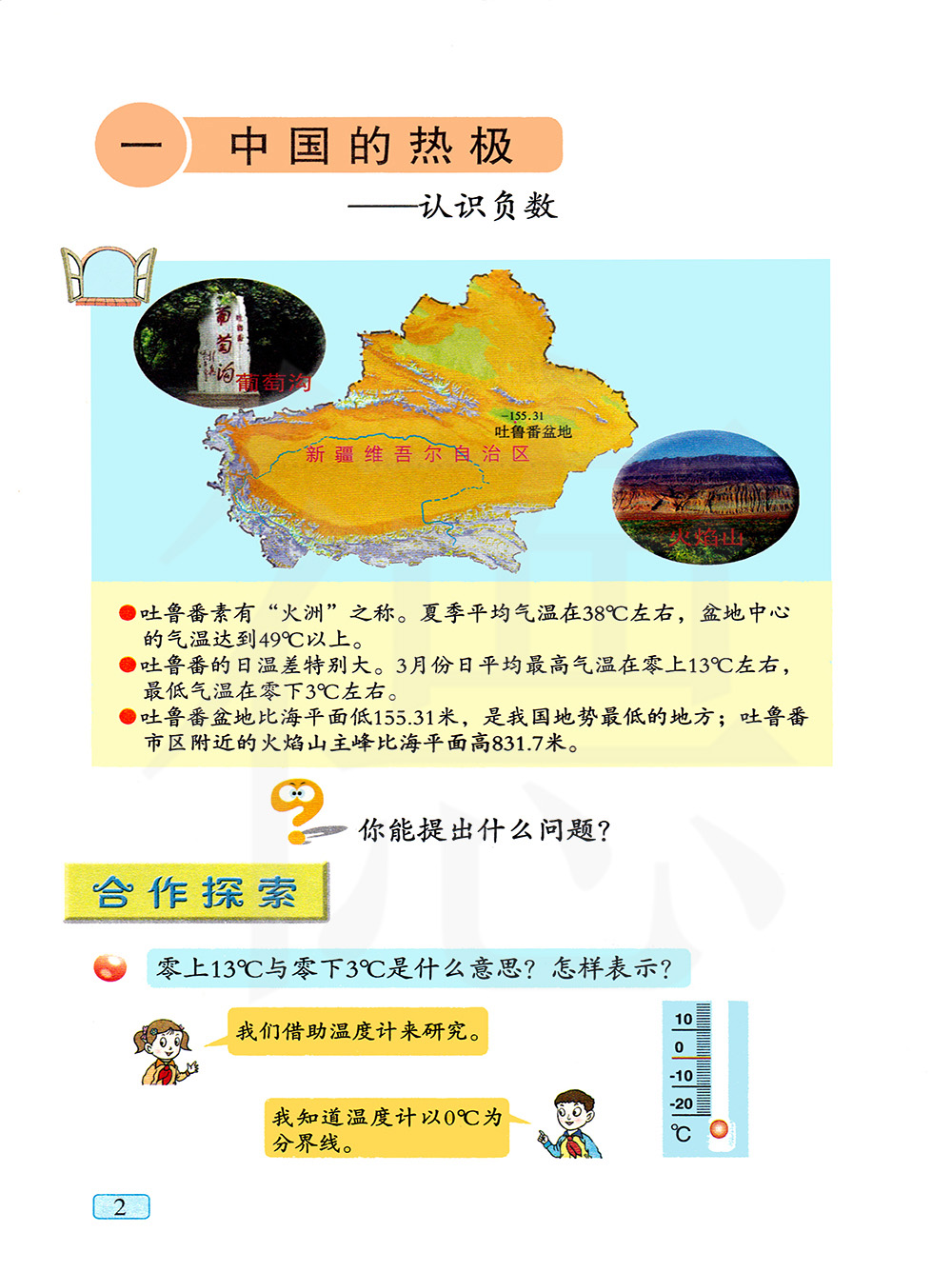 本单元教材安排了一个信息窗, 呈现的是中国的热极——新疆维吾尔族自治区吐鲁番盆 地的情景,借助问题“零上 13℃与零下 3℃是什么意思?引入正负数意义的研究,借助温度 计和海拔高度示意图引导学生探索出正负数的意义及其读写方法, 同时能用正负数描述生活 中具有相反意义的量,体会正、负数与生活的密切联系,重点突出对正负数意义的学习。 本单元是在学生已经认识自然数、 小数和分数的基础上编排的, 是对数的认识的又一次 扩展, 是对今后学习有理数及其运算的基础。 本单元选取具有典型意义的素材,以 “中国的 热极—吐鲁番”为现实背景,从温度的表示方法入手,借助温度计来学习正、负数的知识, 并且充分利用学生已有的生活经验学习新知。