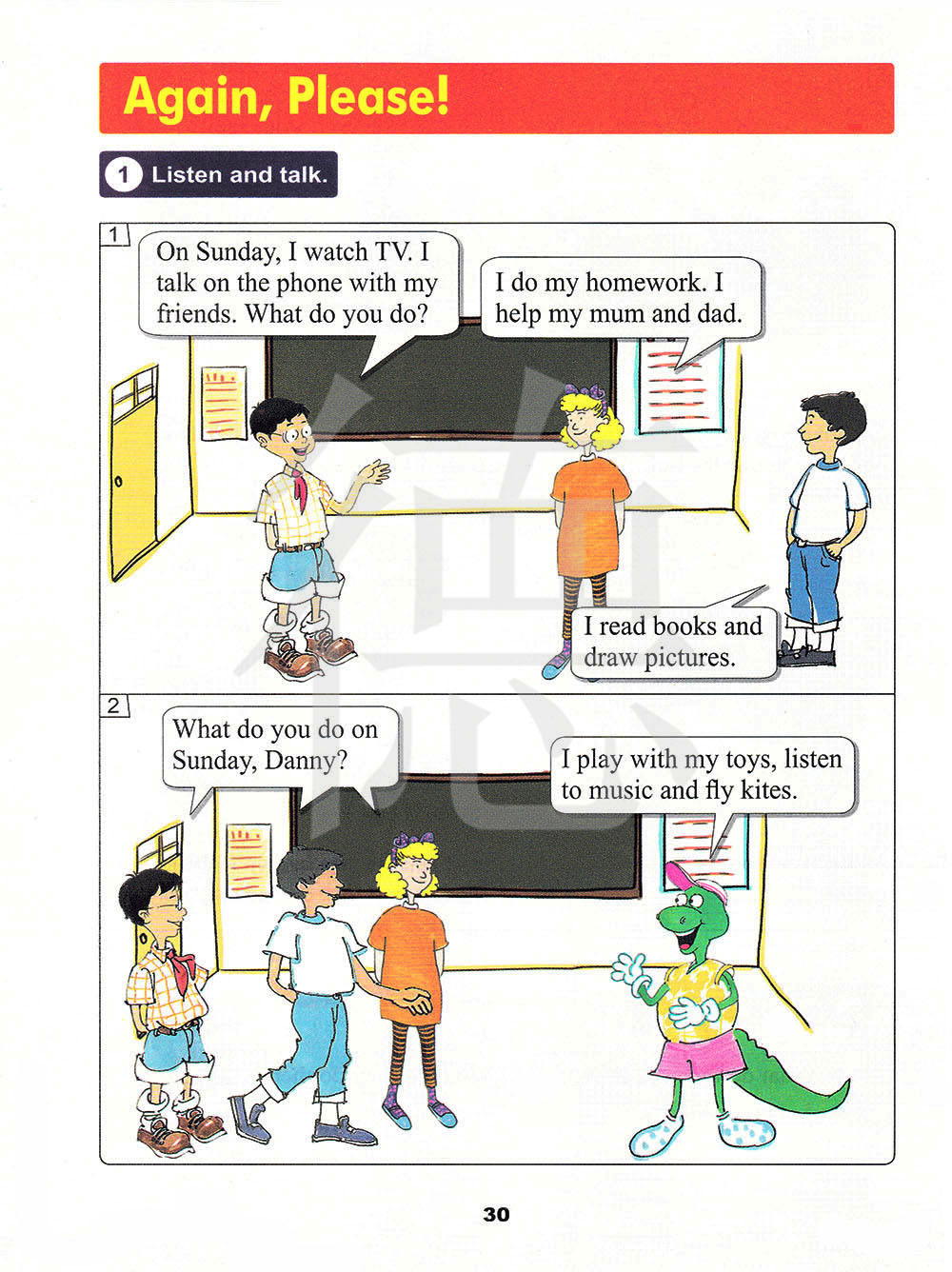 在星期日,我看电视。我和我的朋友们讲电话。你做什么?