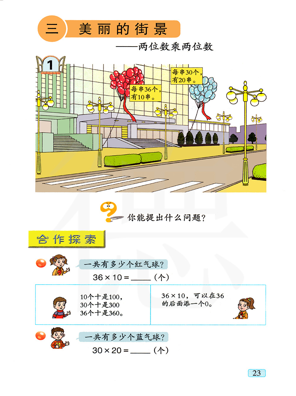 1、口算乘法:整十、整百的数相乘,只需把0前面的数字相乘,再看两个因数一共有几个0,就在结果后面添上几个0。