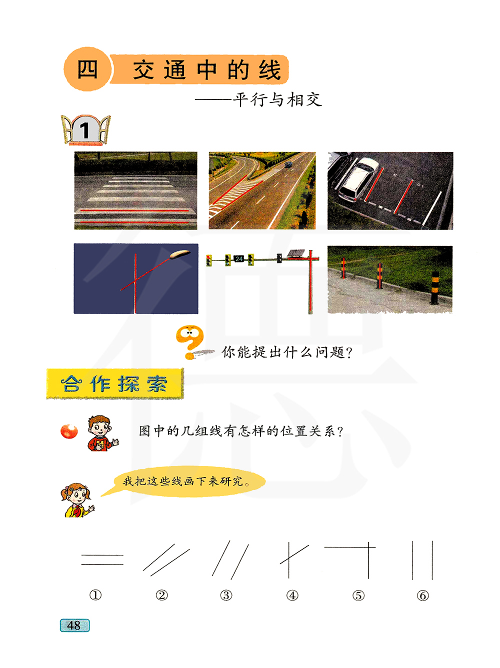 教材以交通中的线为素材,通过学生熟悉的交通设施、交通标志呈现出探究的素材更有利于学生联系实际理解知识,同时将生活情境融入学生现实的学习生活中,也更好地体现了数学的应用价值,更有利于学生从数学的视角观察生活,激发学习的兴趣。