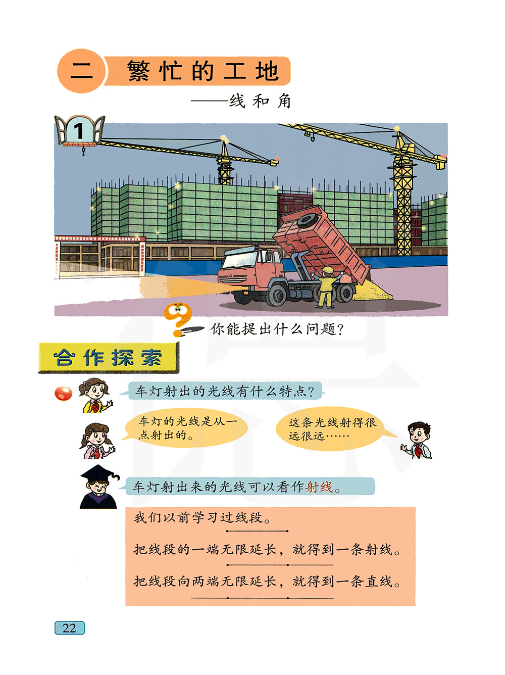 教材重视引导学生动手做数学,通过画一画让学生体会把线段的一端无限延长,就得到一条射线,把线段的两端无限延长就得到一条直线,过一点画两条射线形成一个角;用量角器度量角的度数,借助量角器画指定的角;通过玩活动角学习平角和周角。
