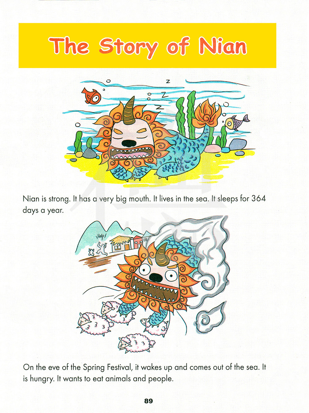 春节的前夕,它醒来并从海里出来了。它非常饿。它想去吃动物和人类。