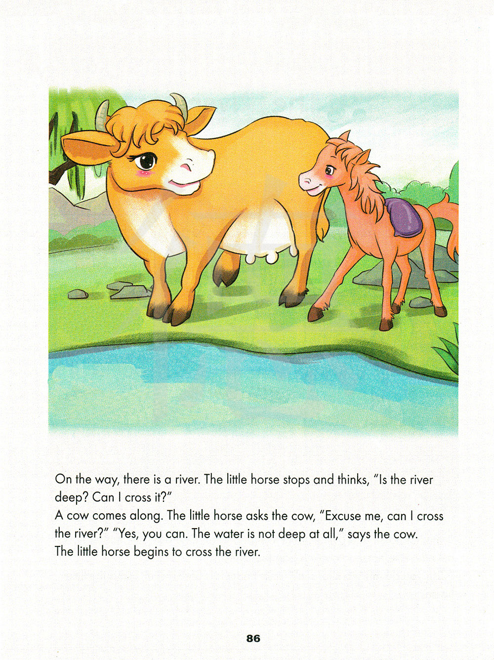 一头奶牛向前走来。这匹小马问那头奶牛,“打扰一下,我能过这条河吗?”“是的,你可以。那水一点也不深,”那头奶牛说道。