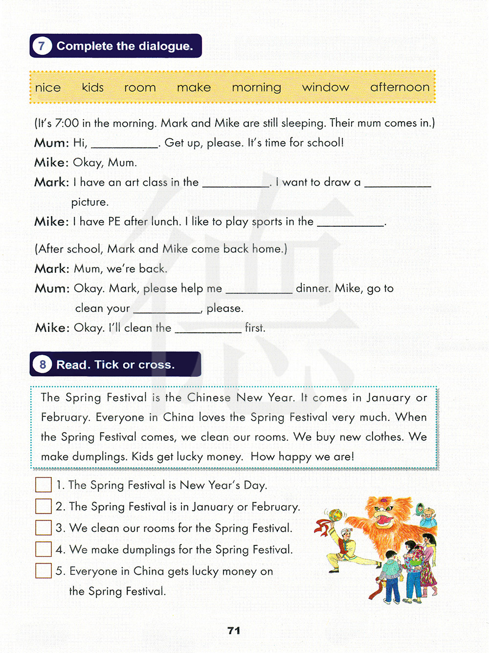 春节是中国新年。它在一月或二月到来。在中国的每一个人都非常喜欢春节。当春节来临的时候,我们打扫我们的房间。我们会买新衣服。我们包饺子。孩子们会收到压岁钱。我们多开心呀!