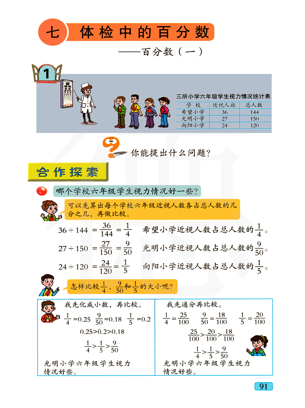 本单元共安排了2个信息窗和相关链接。第一个信息窗是检查视力,借助问题“哪个学校六年级学生视力情况好一些”引入对百分数的意义及读写的学习。“相关链接”借助问题 “你能把下面的数化成百分数吗?”“能能把19%和25%化成分数吗”、“你能把3%、0.7%、123%化成小数吗”,引入对小数、分数和百分数互化的学习。第二个信息窗是测量体重,借助问题“男生体重合格人数占总人数的百分之几”, “这个班的出勤率是多少”,引入对求一个数是另一个数的百分之几和出勤率的学习。