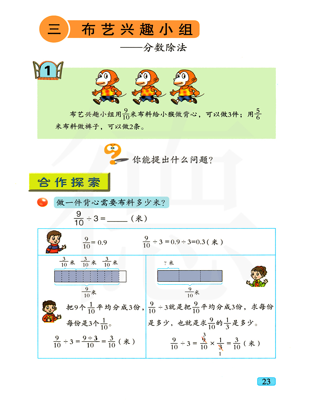 本单元一共安排了3部分内容,第一部分是分数除法,在这一部分中教材一共安排了5道例题。例1是认识倒数,教材通过几个小朋友的对话,揭示了倒数的概念。例2是借助卫生大扫除的情境,教学分数除以整数。例3是教学整数除以分数。例4是教学分数除以分数。例5是分数连除或分数乘除混合运算。