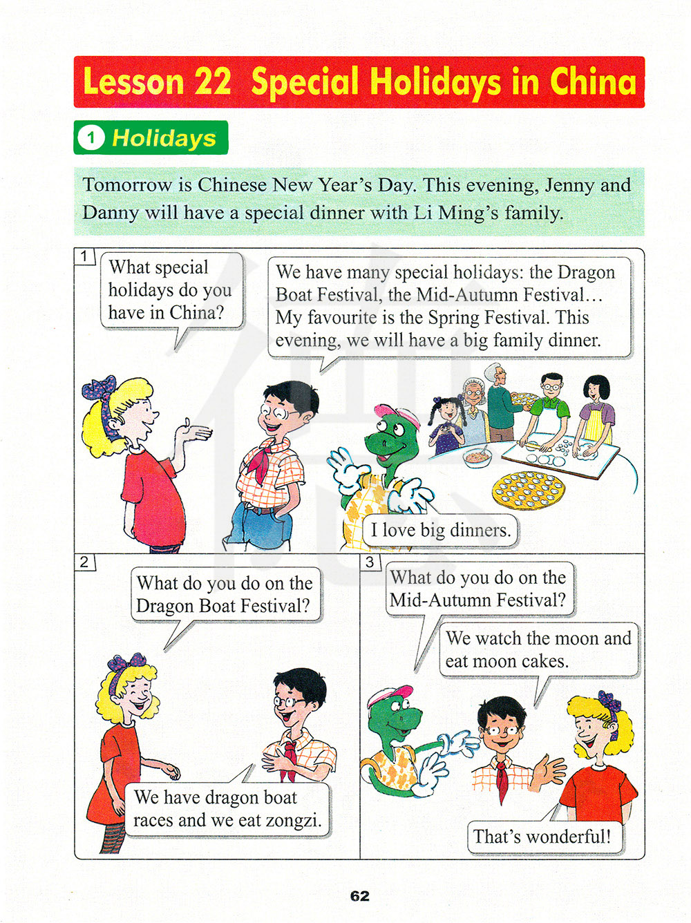 我们有许多特别的节日:端午节,中秋节...... 我最喜欢春节。今天晚上,我们将会有一个盛大的家庭晚宴。