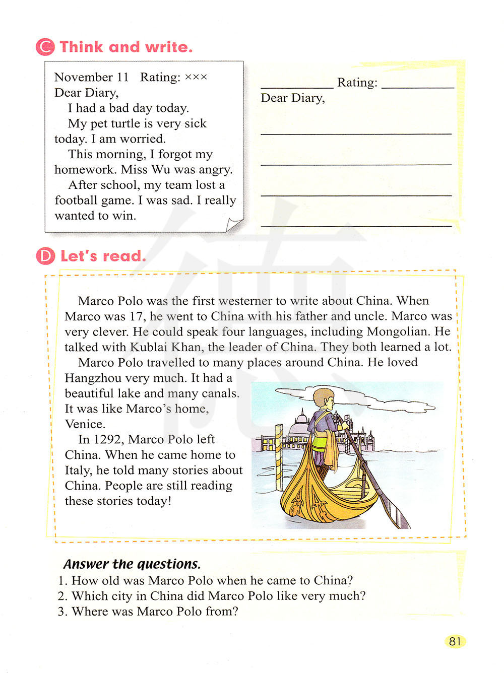 马克·波罗游历了中国的很多地方。他非常喜欢杭州。那里有个漂亮的湖泊和很多运河。就像马克的家乡,威尼斯。