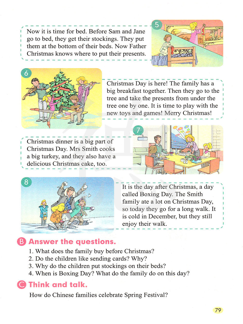 圣诞节的第二天,这天称为节礼日。 7907 7907a w 350 The Smith family ate a lot on Christmas Day, so today they go for a long walk. 史密斯一家在圣诞那 天吃了很多,所以今天他们去散步。 7908 7908a w 350 It is cold in December, but they still enjo