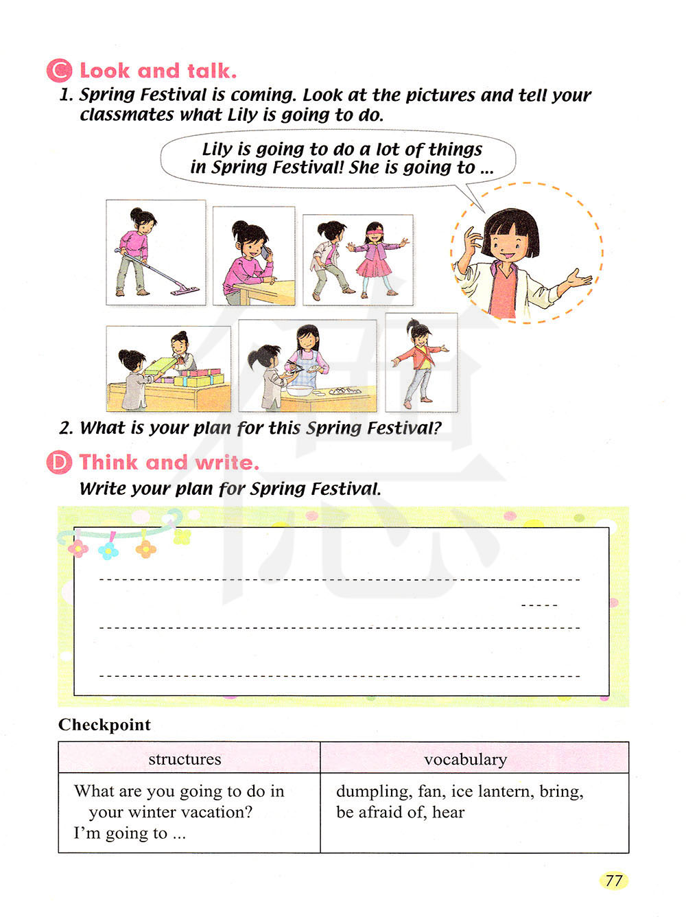 春节快要到了。看图片,告诉你的同班同学,莉莉打算做什么。