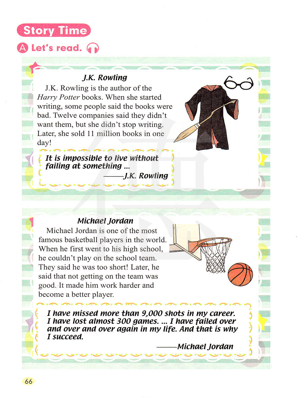 J.K.罗琳是哈利·波特系列书的作者。当她开始写的时候,有些人说这些书不好。12家公司说不想要它们,但她没有停止写作。后来,她的书一天内售出了一千一百万本。
