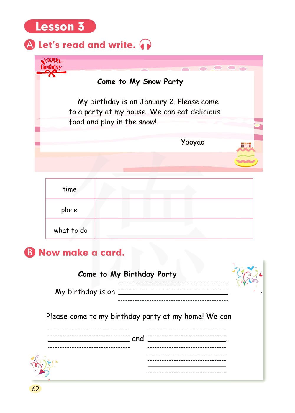 我的生日在1月2日,请来我家参加聚会,我们可以吃到美味的食物,并在雪中玩耍!