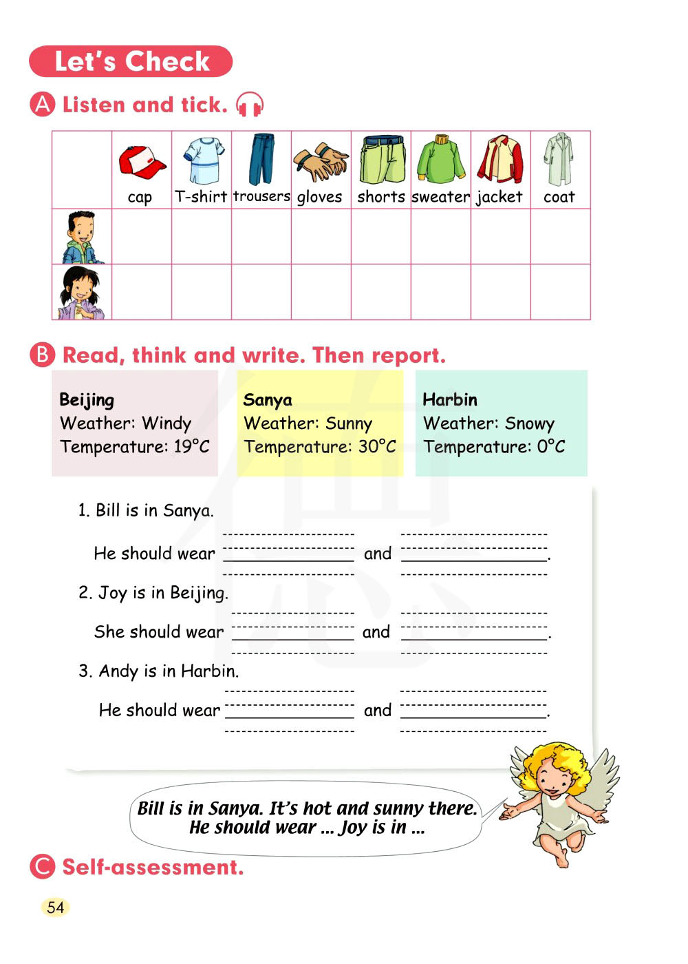 比尔在三亚,那里很热并且是晴天。他应该穿.....乔伊在......